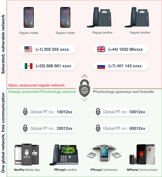 The Ecosystem is entirely closed and invisible from the public internet, and only the PTechnology provided and configured devices are able to connect to the infrastructure. Those devices can flawlessly run our unique, continuously updated cryptographic processes to protect audio and video your calls.