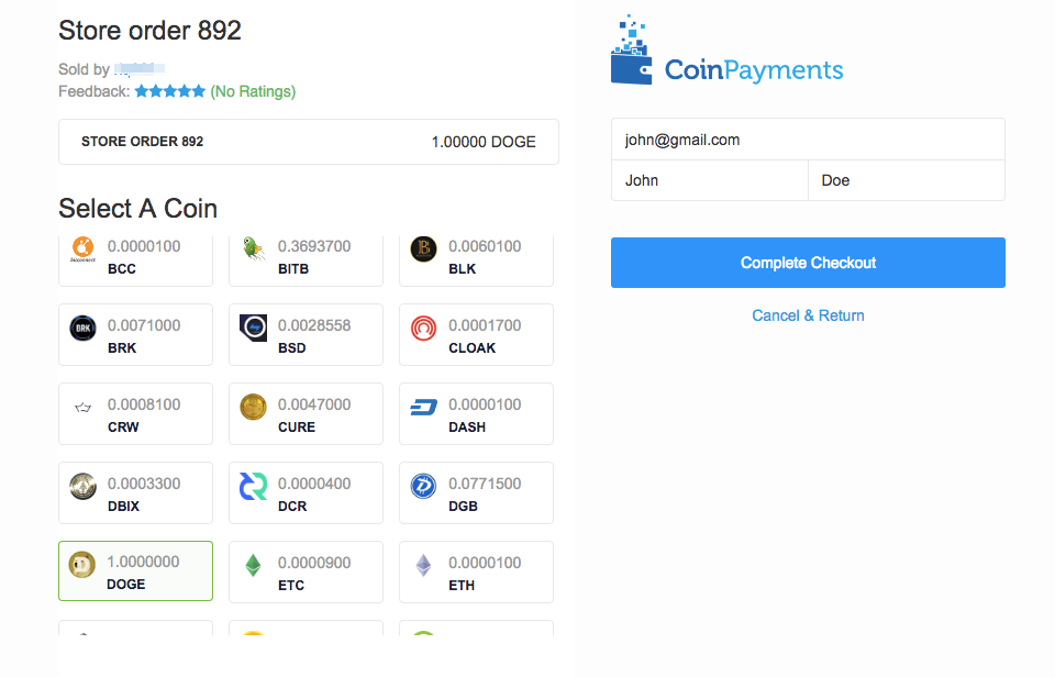 On the CoinPayments first page, select the coin and click the "Complete Checkout" button.